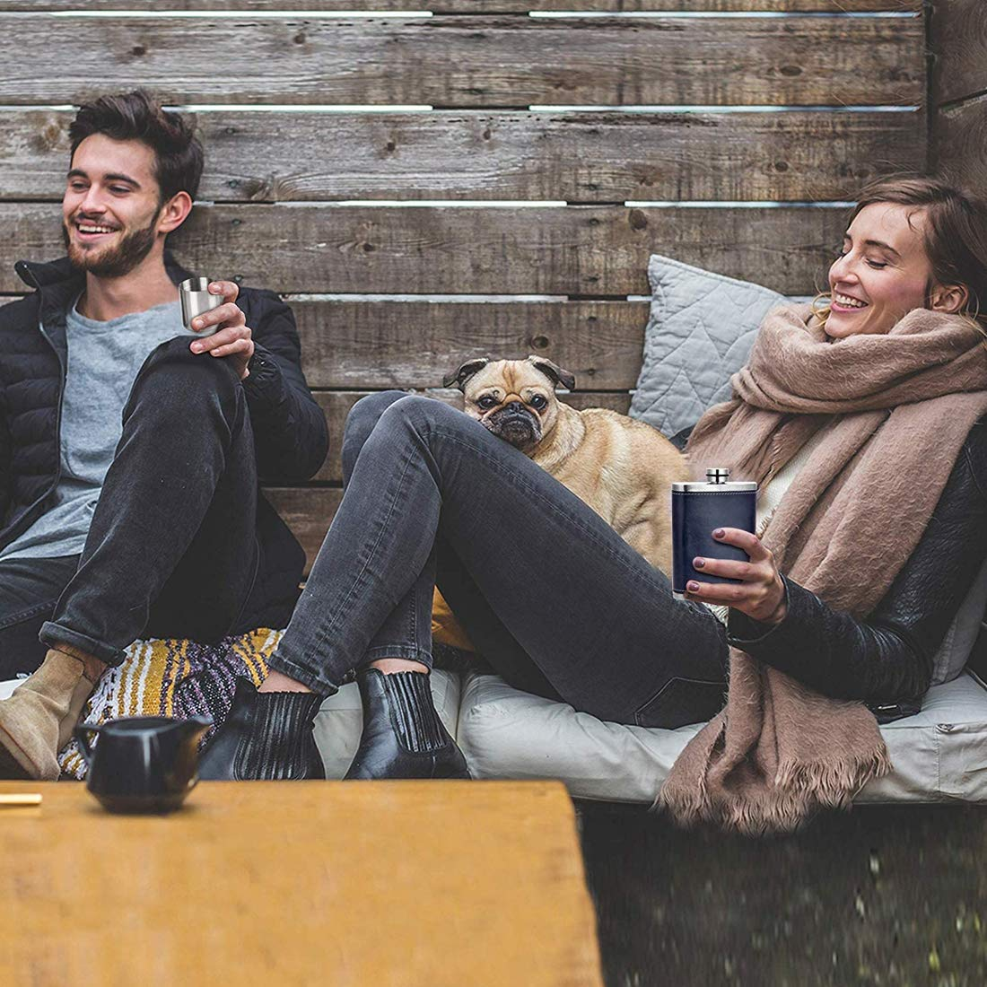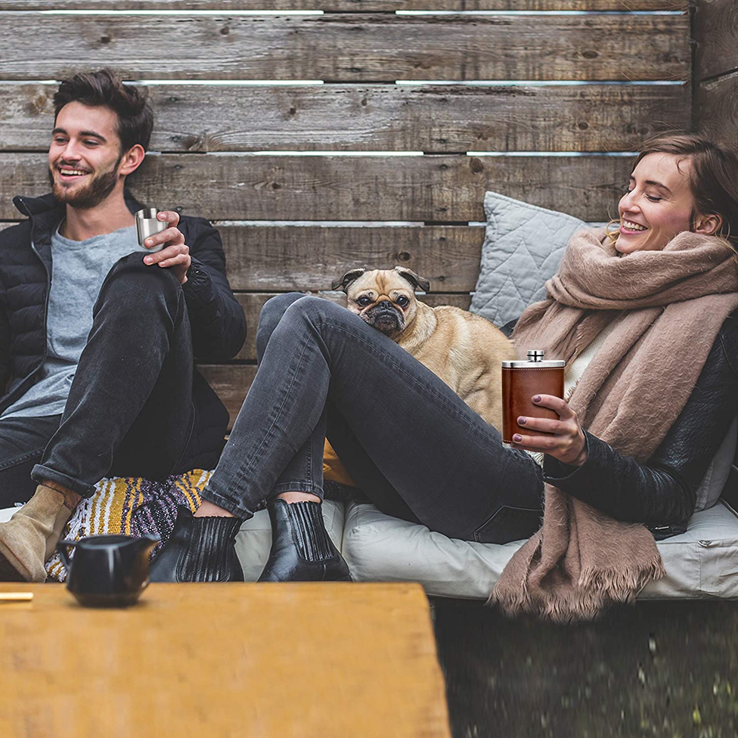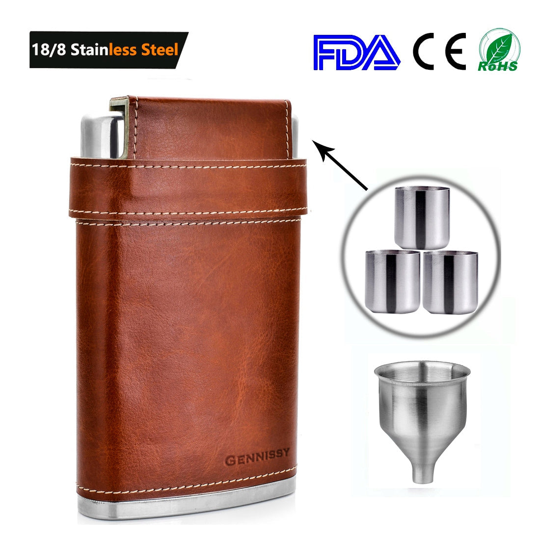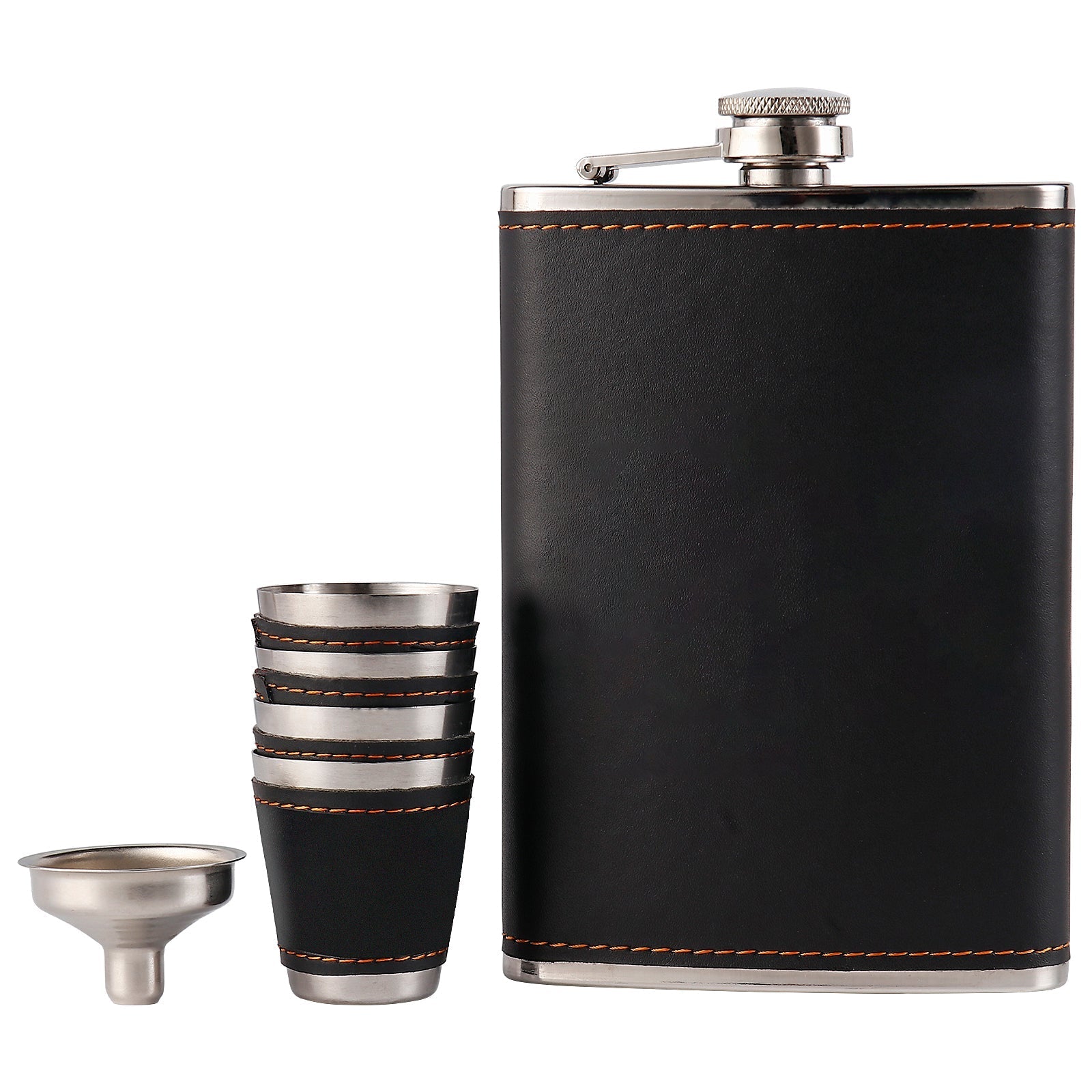 100 % LEAK PROOF - High-frequency welding laser-free solder, thick stainless steel lid thread processing, air-pressured and quality controlled.wrapped in brown PU leather. The cap seals tightly to make sure no vodka, whiskey, bourbon or other favorite beverage will leak out or wasted.